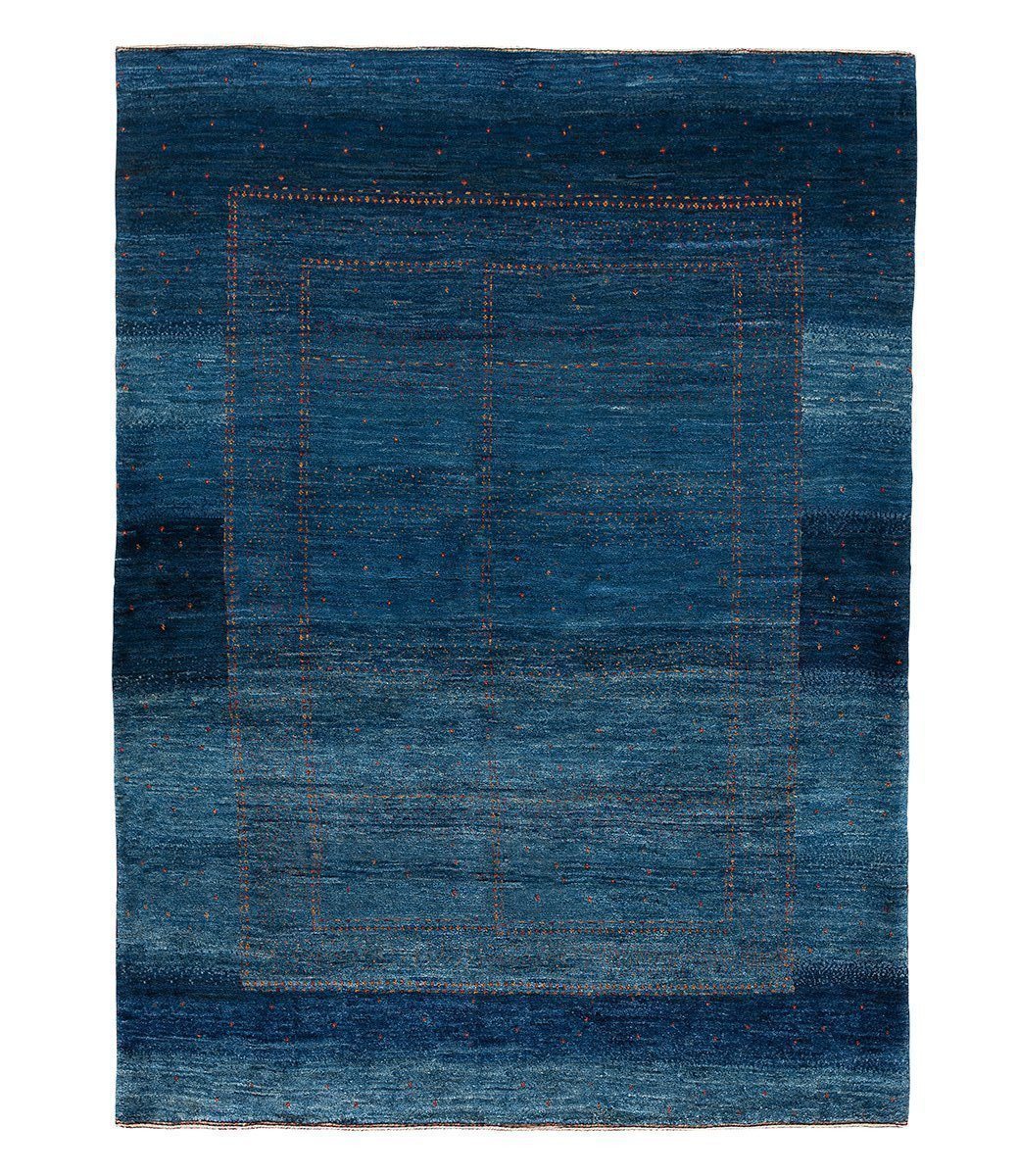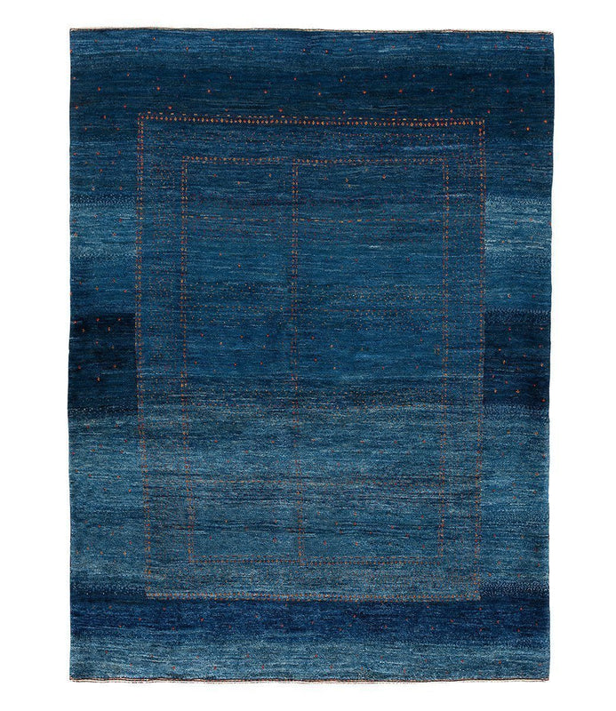 This one of a kind gabbeh was hand knotted using 100% Persian wool. It measures 4' 9" x 6' 7" in a cornflower blue ombré design.