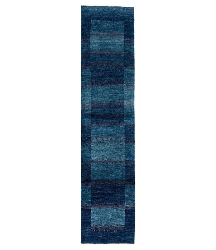 A unique piece, this runner was hand knotted using 100% Persian wool. The organic transition of the blue field is a result of using unbleached wool and vegetable-based dyes. The different colored wools absorb dye differently, resulting in a rich range of tones across this carpet. It measures 3' x 12' 8".