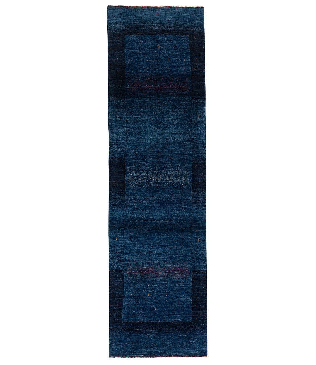 This Persian gabbeh runner was hand knotted using 100% Persian wool. It measures 2' 7" x 9' 4". A deep indigo palette woven in an ombré pattern makes this rug a handsome addition to any room.