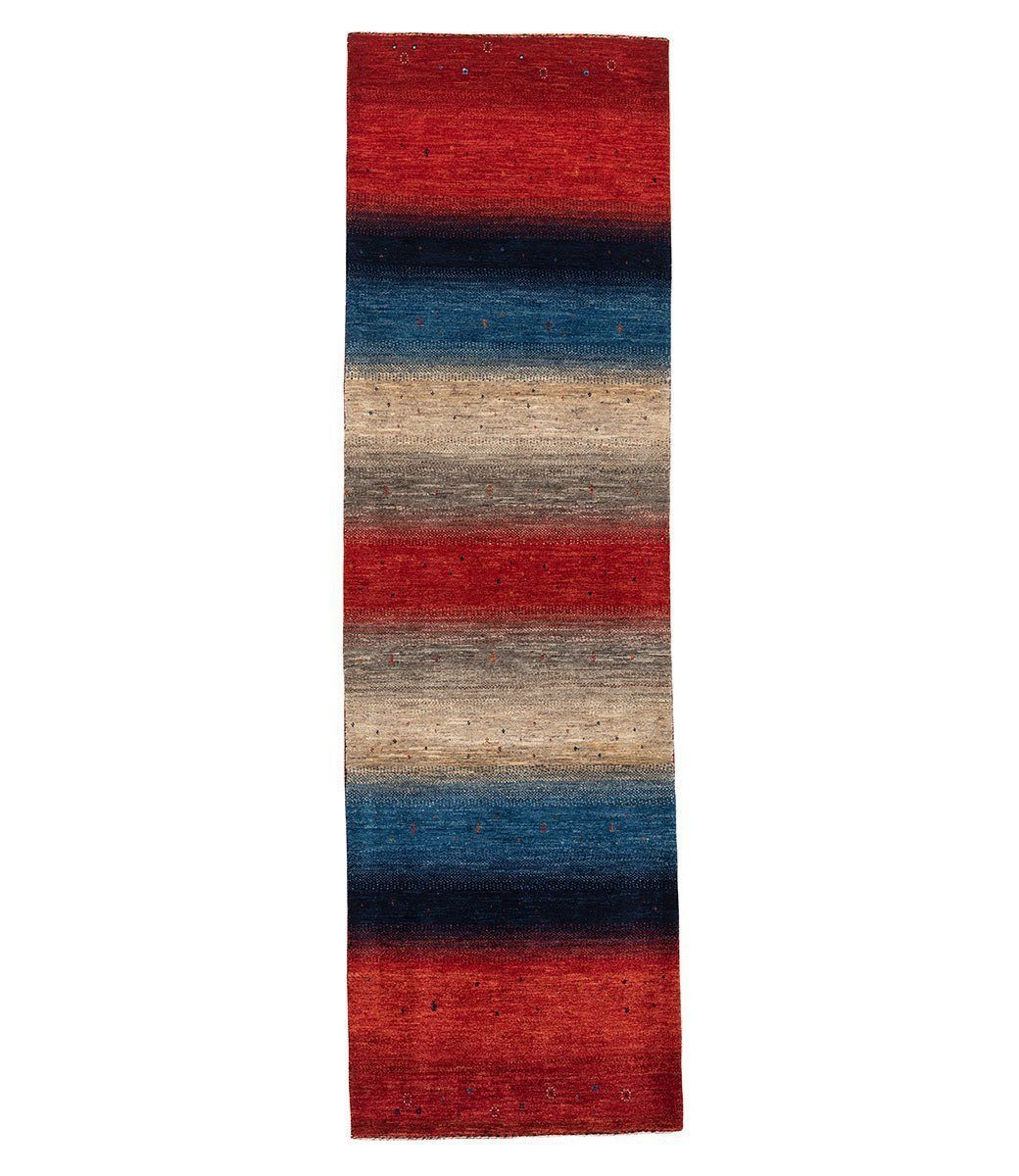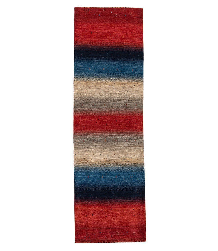 This one of a kind gabbeh was hand knotted using 100% Persian wool. It measures 2' 10" x 9' 6". A bright, colorful palette is woven into beautiful ombré stripes.