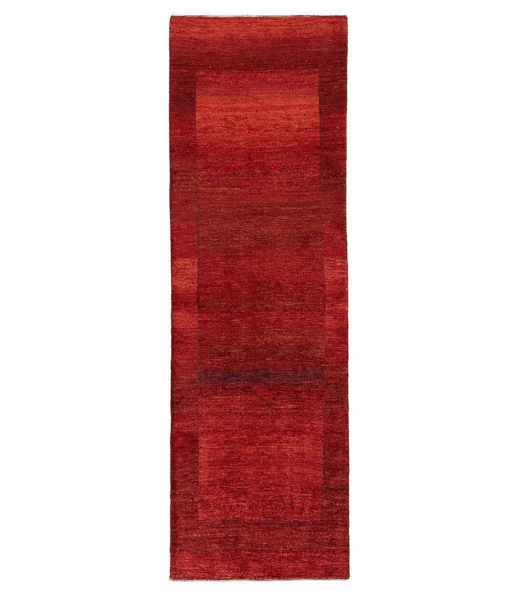 This traditional style red Gabbeh was crafted of 100% wool and measures 2' 11" x 9' 5". Vegetable dyed red yarn has been woven into a subtle ombré pattern.