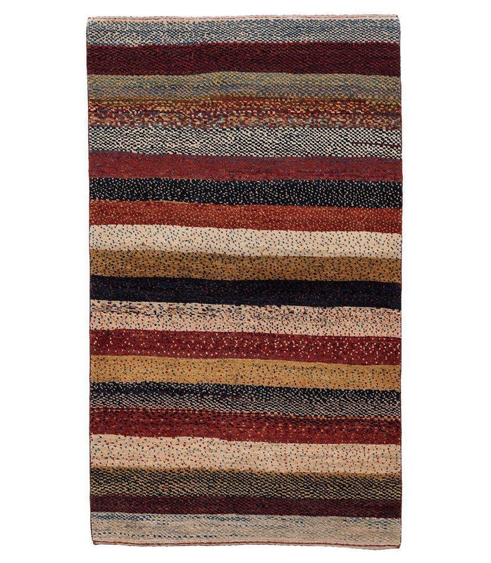 This gabbeh was hand knotted of 100% Persian wool. The multi-color shades were achieved through vegetable dyes, in the traditional style of these carpets. This rug is a one of a kind and only available as a 3'5"X 5'9".
