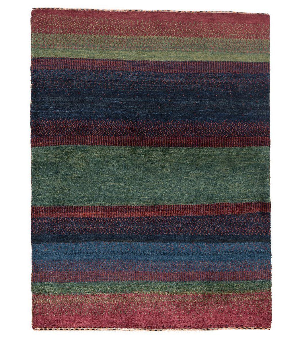 This gabbeh was hand knotted of 100% Persian wool. The multi-color ombre shades were achieved through vegetable dyes, in the traditional style of these carpets. This rug is a one of a kind and only available as a 3'3"X 4'3"