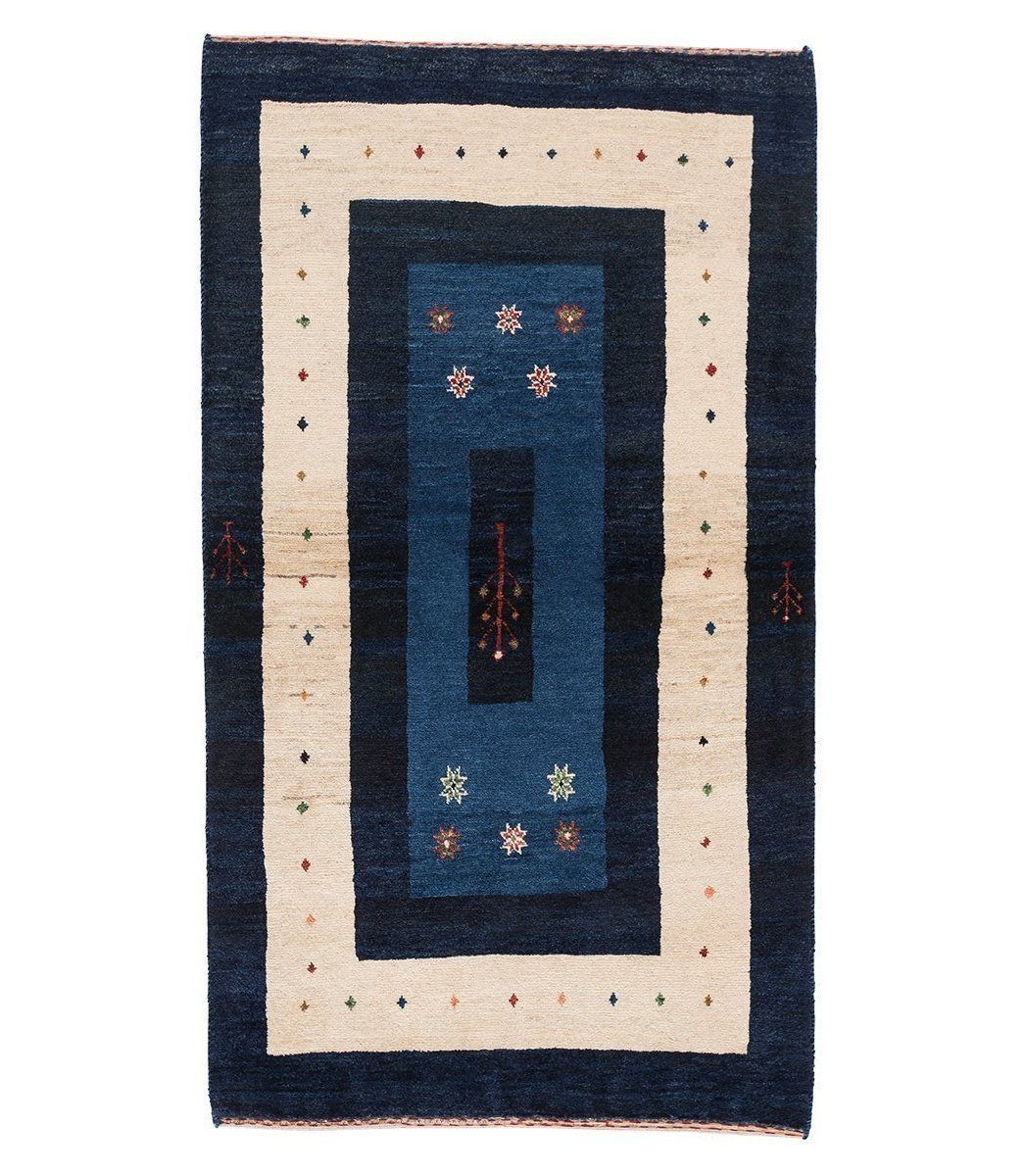 This gabbeh was hand knotted of 100% Persian wool. The bold shades of blue were achieved through vegetable dyes, in the traditional style of these carpets. This rug is a one of a kind and only available as a 2'11"X 5'1".