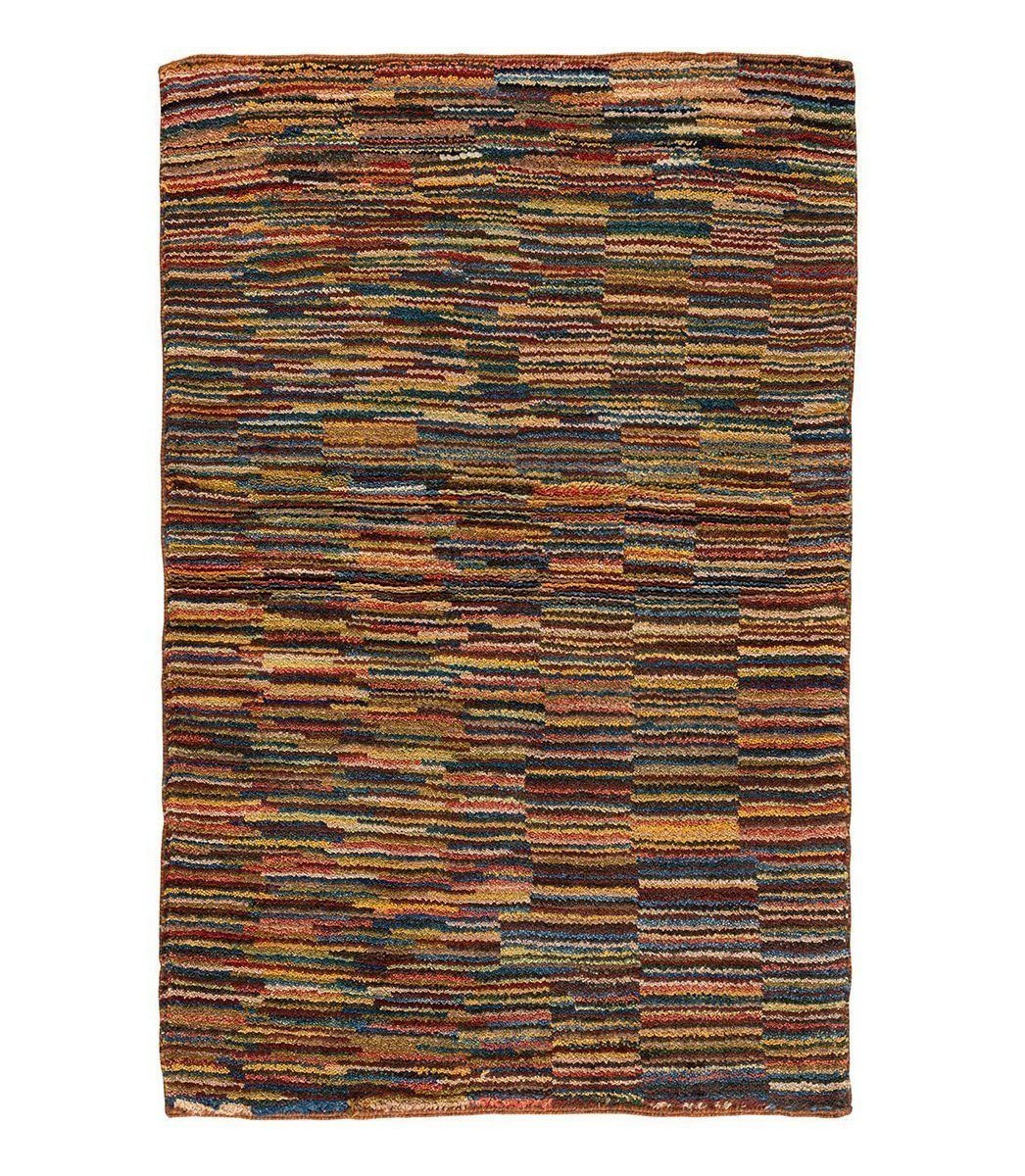 This gabbeh was hand knotted of 100% Persian wool. The multi-color shades were achieved through vegetable dyes, in the traditional style of these carpets. This rug is a one of a kind and only available as a 2' 6" x 3' 9".