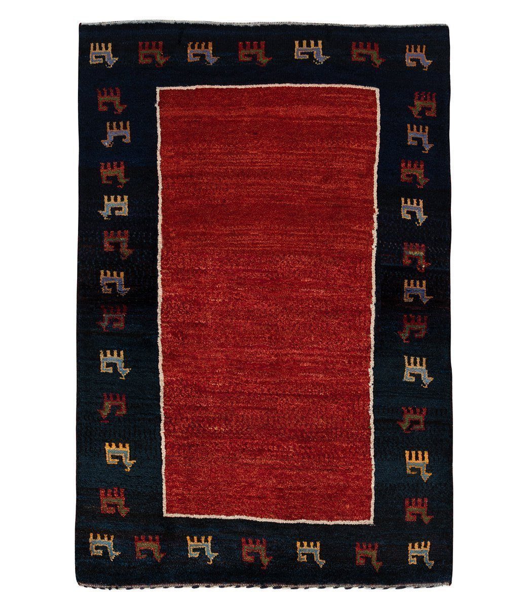 This gabbeh is hand knotted of 100% Persian wool. The multi-color shades were achieved through vegetable dyes, in the traditional style of these carpets. This rug is a one of a kind and only available as a 3' 3" x 4' 10".