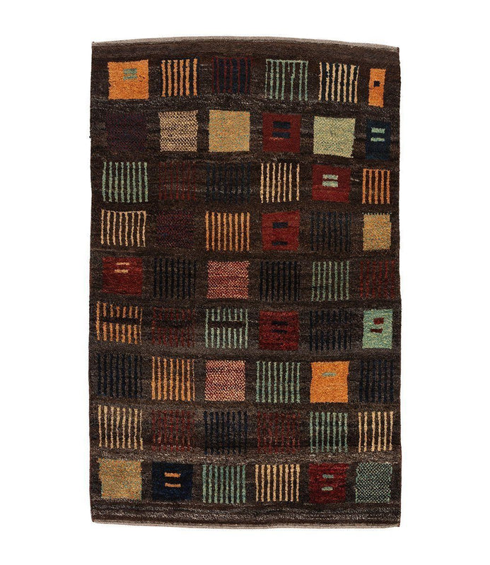 This gabbeh was hand knotted of 100% Persian wool. The multi-color shades were achieved through vegetable dyes, in the traditional style of these carpets. This rug is a one of a kind and only available as a 2' 6" x 3' 11".