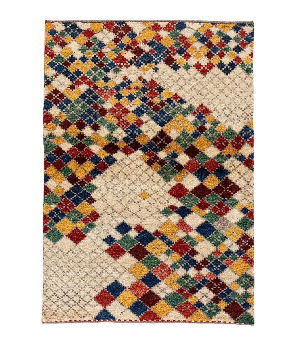 A one-of-a-kind piece, this Persian gabbeh is woven using 100% Persian wool. It features vegetable dyed wool hand knotted into a naïve, geometric pattern and measures 3' 3" x 4' 7".