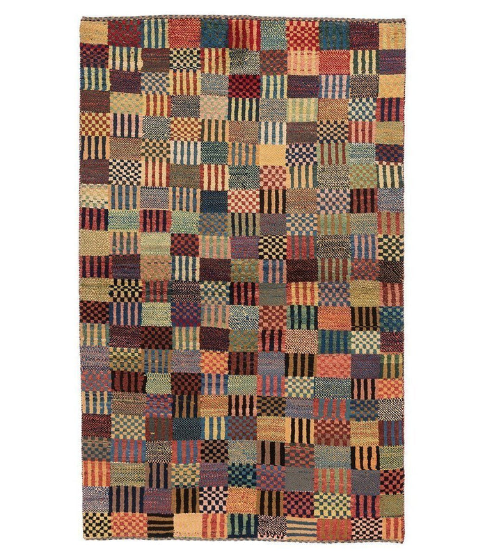 This gabbeh was hand knotted of 100% Persian wool. The multi-color shades were achieved through vegetable dyes, in the traditional style of these carpets. This rug is a one of a kind and only available as a 3'8" X 5'11".