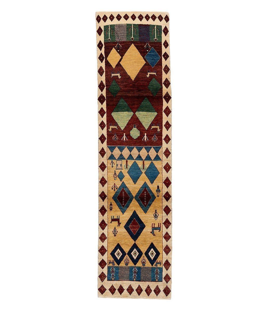 This traditional one-of-a-kind gabbeh is a runner that measures 2' 6" x 9' 11". It was crafted by hand of 100% vegetable-dyed Persian wool.
