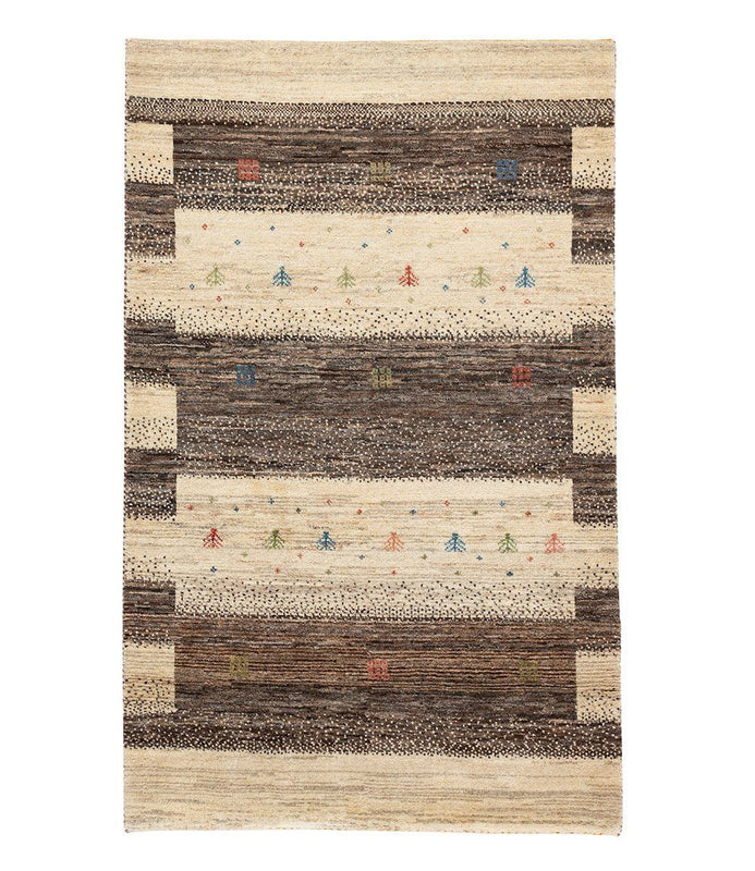 This Persian gabbeh was hand knotted using 100% Persian wool. It is a one of a kind carpet that measures 2' 7" x 4' 2".