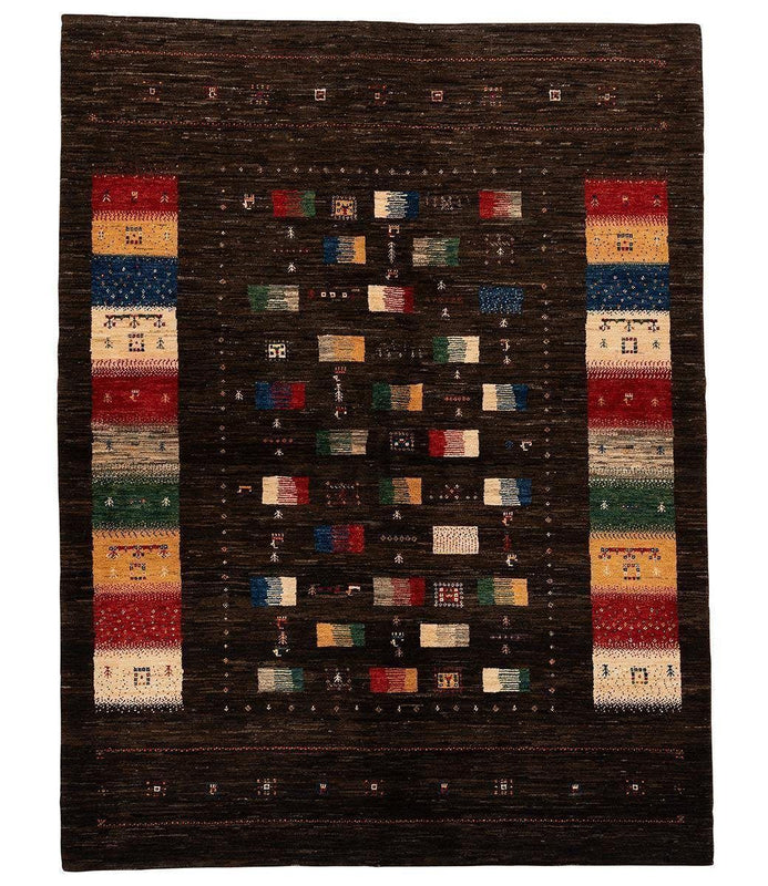 This multi-colored one-of-a-kind gabbeh rug measures 5' 3" x 6' 10". It was hand knotted of 100% Persian wool.