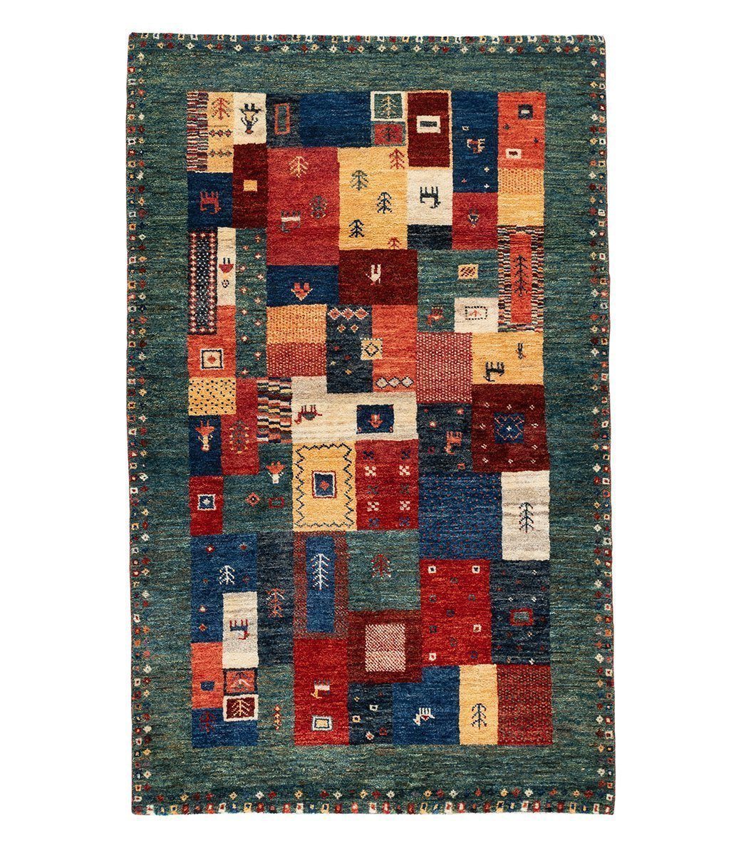 This one-of-a-kind gabbeh rug is hand knotted of 100% vegetable-dyed Persian wool. The exact measurements are 2' 10" x 4' 7".
