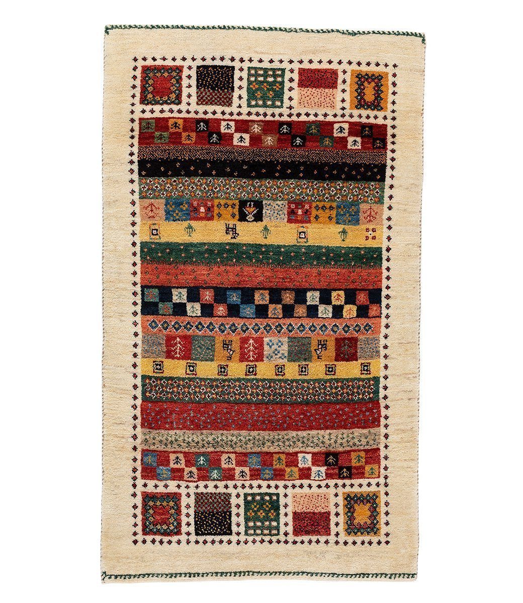 This multi-colored one-of-a-kind gabbeh rug measures 2' 5" x 4' 3". It was hand knotted of 100% Persian wool.