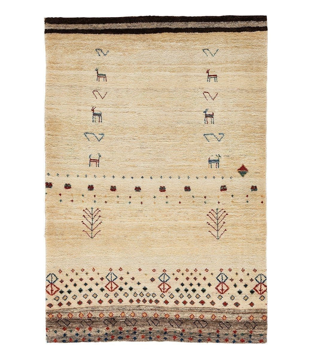 This multi-colored one-of-a-kind gabbeh rug measures 2' 7" x 3' 10". It was hand knotted of 100% Persian wool.