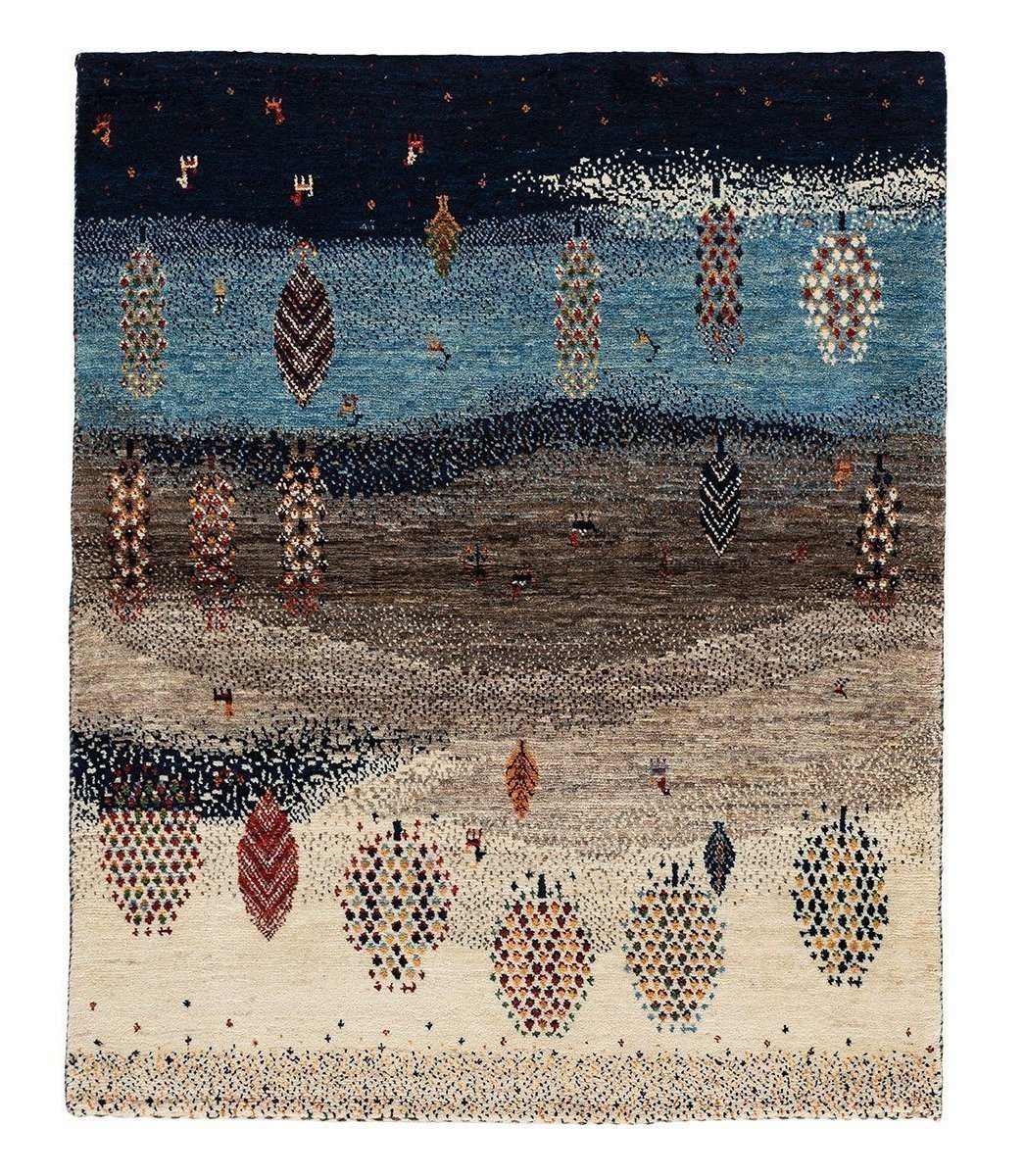 This multi-colored one-of-a-kind gabbeh rug measures 3' 3" x 4' 0". It was hand knotted of 100% Persian wool.
