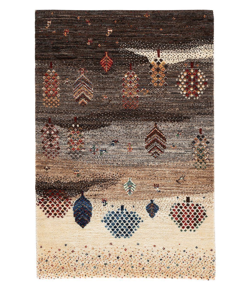 This multi-colored one-of-a-kind gabbeh rug measures 2' 1" x 3' 1". It was hand knotted of 100% Persian wool.