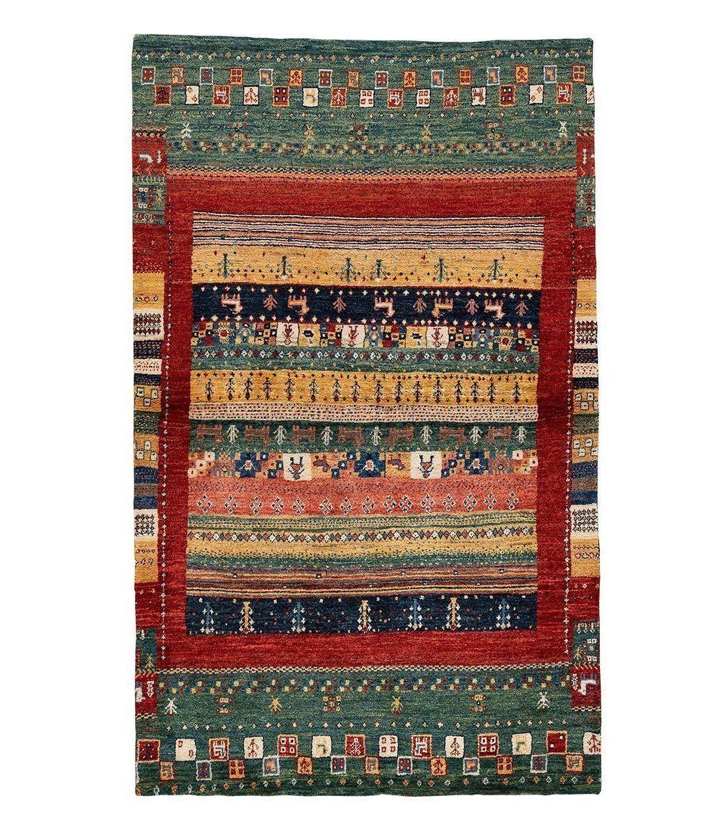 Hand knotted using undyed, unbleached Persian wool, this Persian gabbeh is a one of a kind piece. This one-of-a-kind piece measures 3' 6" x 5' 9".