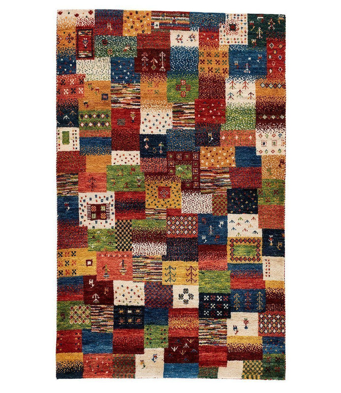 This one-of-a-kind gabbeh rug was hand knotted of 100% vegetable-dyed Persian wool. The exact measurements are 2' 9" x 4' 4".