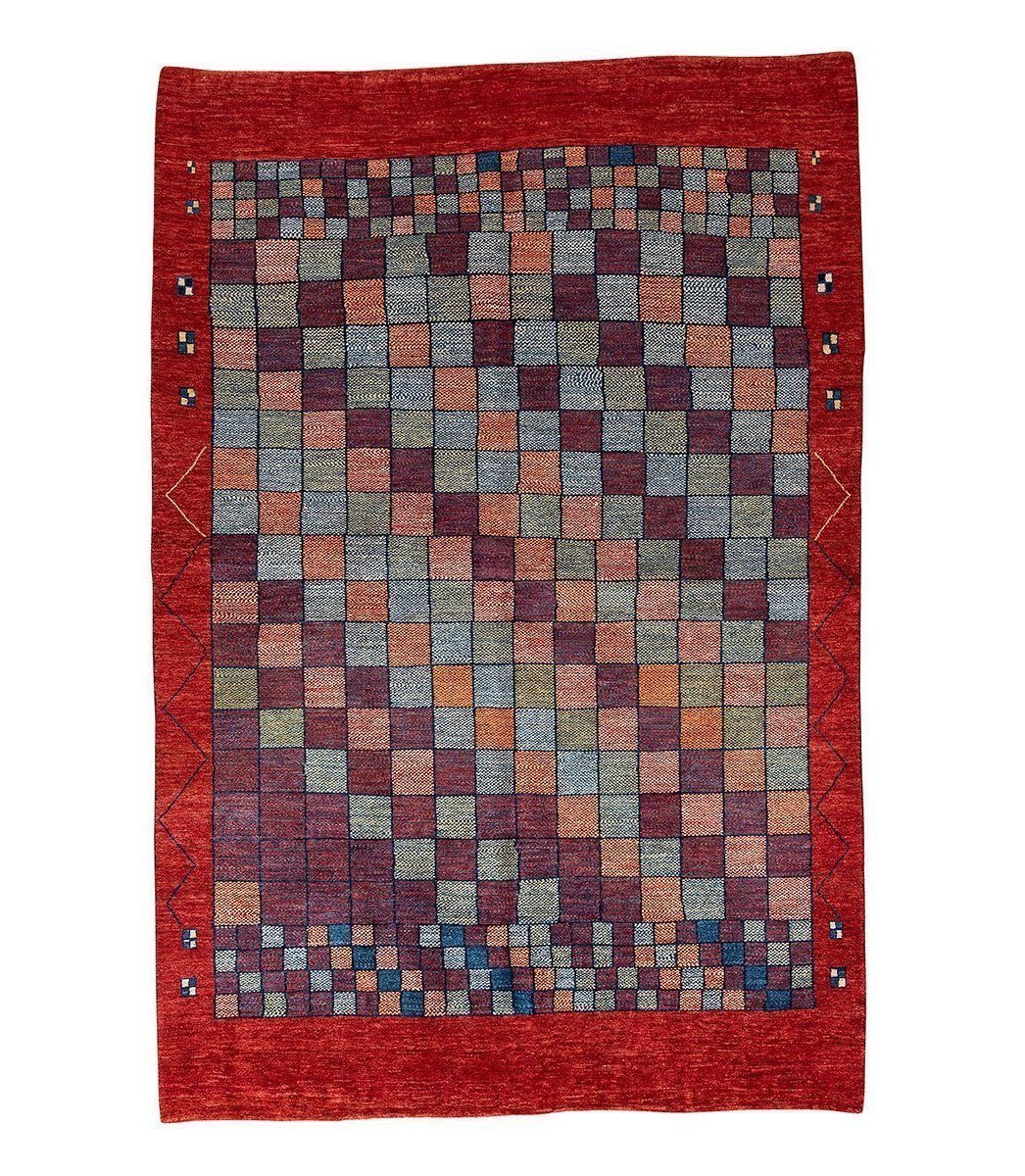 Persian gabbeh Tajik is a one-of-a-kind rug that was hand knotted of 100% Persian wool, and was dyed with vegetable based dyes on unbleached wool. This unique bordered gabbeh measures 5' 3" x 7' 10".