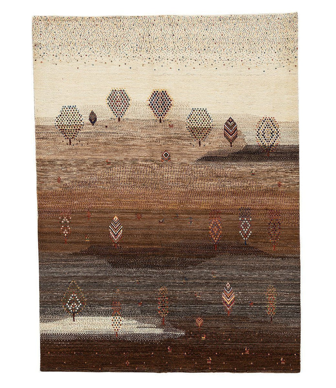 Hand knotted using unbleached Persian wool, this Persian gabbeh is a one of a kind piece featuring tree motifs. This special rug measures 4' 10" x 6' 8".