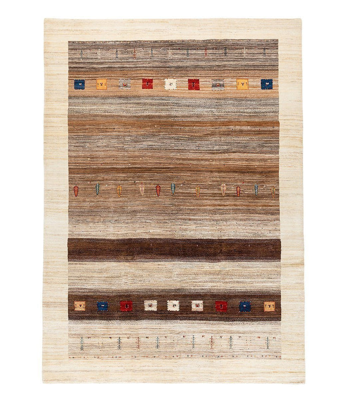 This gabbeh is a hand knotted one-of-a-kind rug. It is woven of 100% Persian wool, in a selection of natural tones with pops of color. This carpet measures 8' 1" x 11' 4".