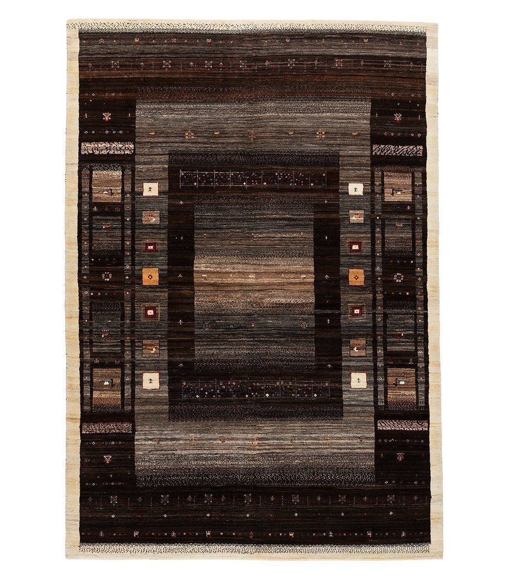 Hand knotted of 100% vegetable-dyed Persian wool, this one-of-a-kind gabbeh measures 5' 5" x 7' 9".