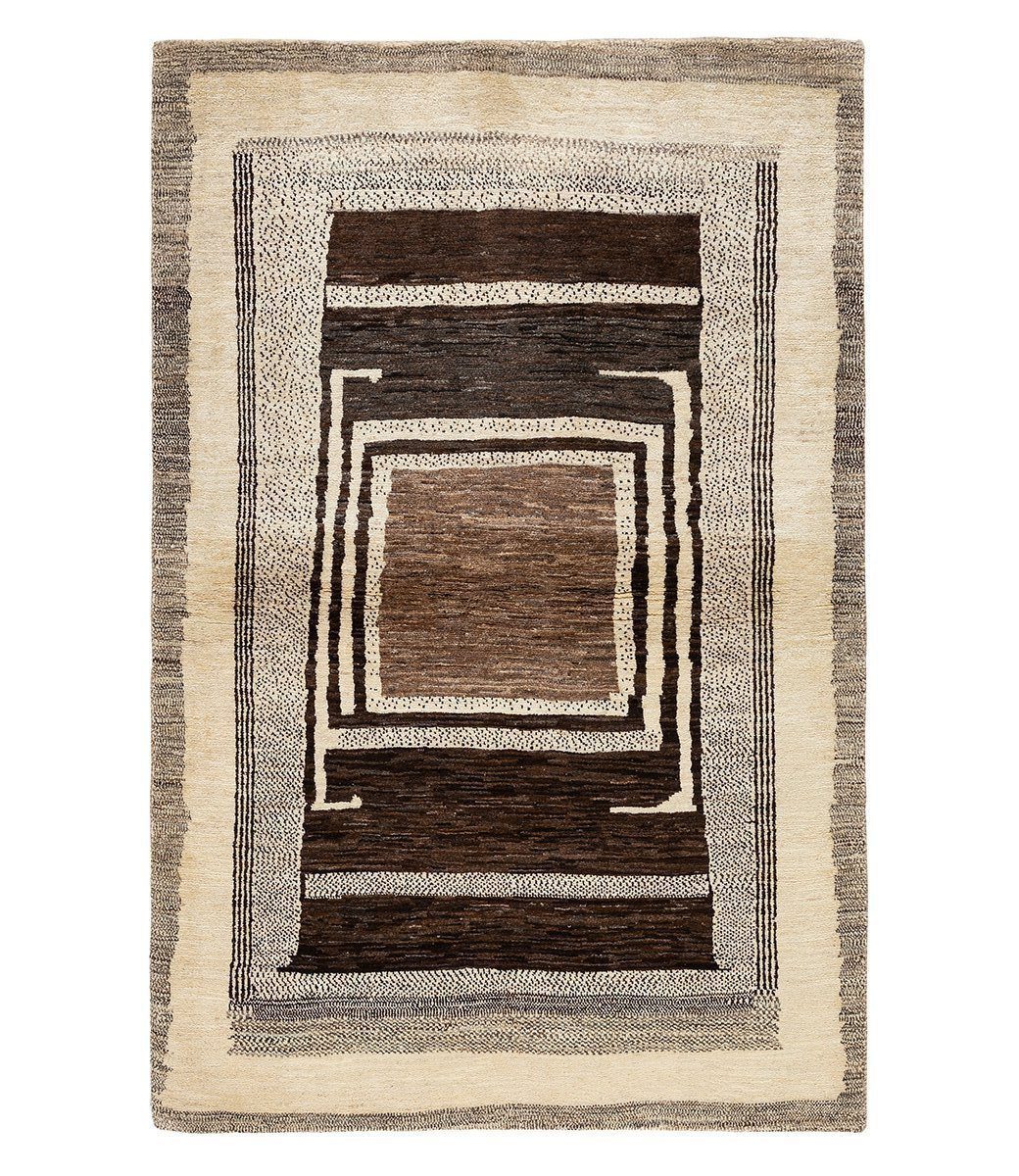 Hand knotted of 100% vegetable-dyed Persian wool, this one-of-a-kind gabbeh measures 3' 11" x 5' 11".