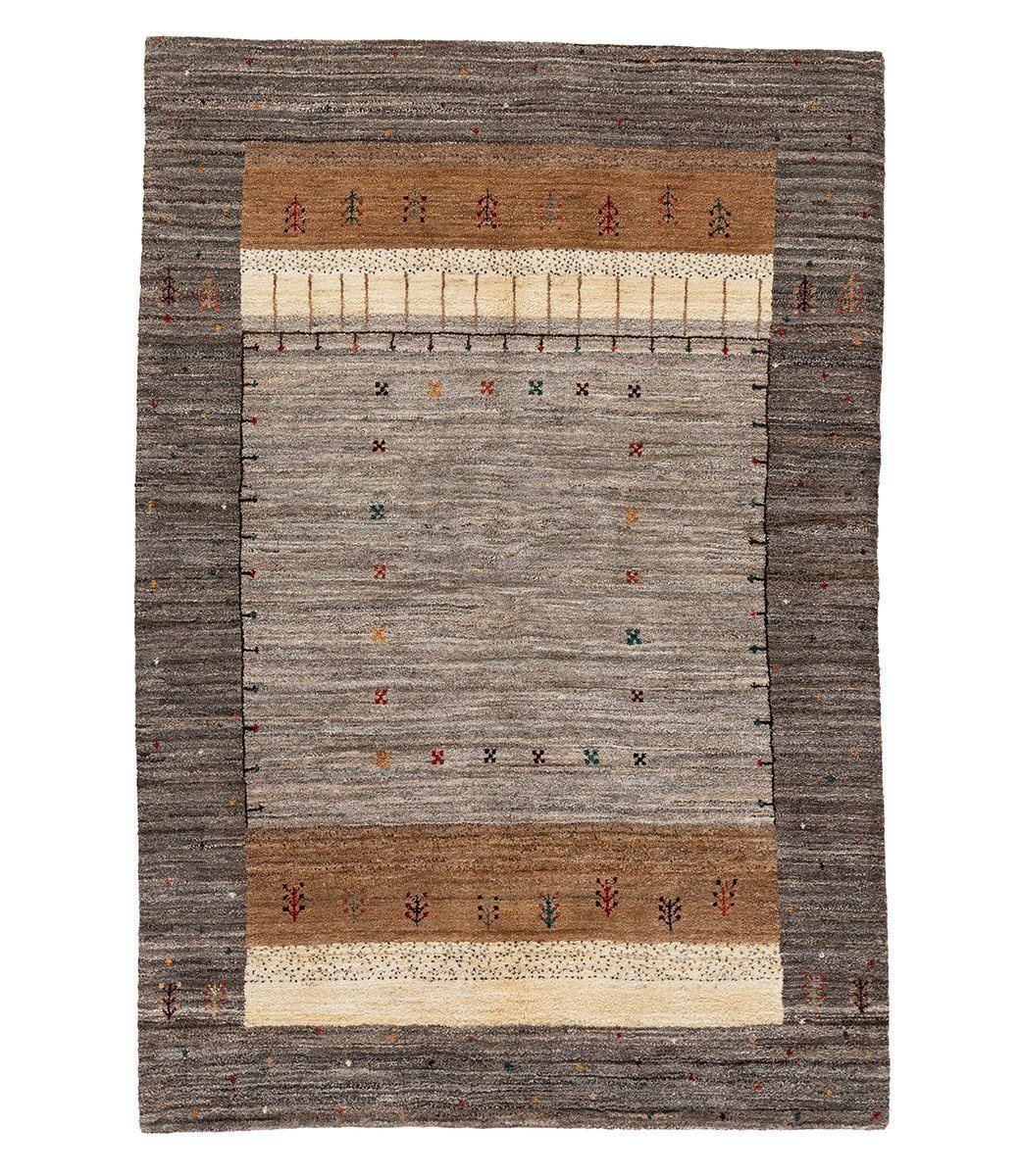 This one-of-a-kind gabbeh measures 4' 6" x 6' 7". Hand knotted of 100% Persian wool, this design was woven using undyed, unbleached yarns.