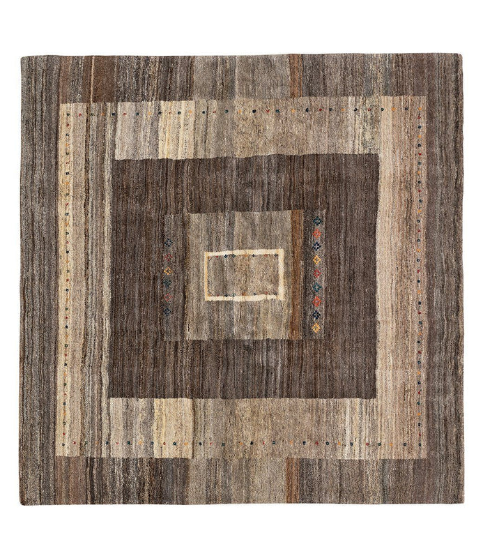 Hand knotted of 100% Persian wool, this one-of-a-kind gabbeh measures 6' 7" x 6' 6". It was hand crafted in Iran using undyed, unbleached yarns.