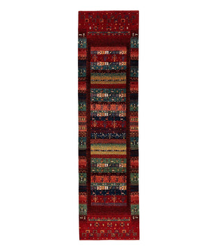 Hand knotted of 100% Persian wool, this one-of-a-kind gabbeh runner rug measures 2' 7" x 9'10". It was hand crafted in Iran using undyed, unbleached yarns.