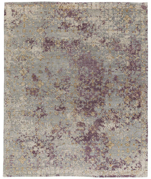 Does the Persian rug peak out of the contemporary organic design or is it the other way around? One thing is for sure, a subtle yet beautiful pattern is emerging in purples, greys, sand, and gold. This one-of-a-kind colorway is only available as an 8 x 10.
