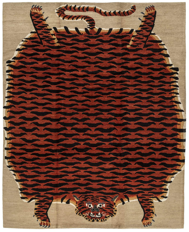 This overstated orange and black tiger with sandy tone background needs a good home and will be well behaved in the right bedroom or media room. This one of a kind rug was hand knotted of 100% wool in Nepal.