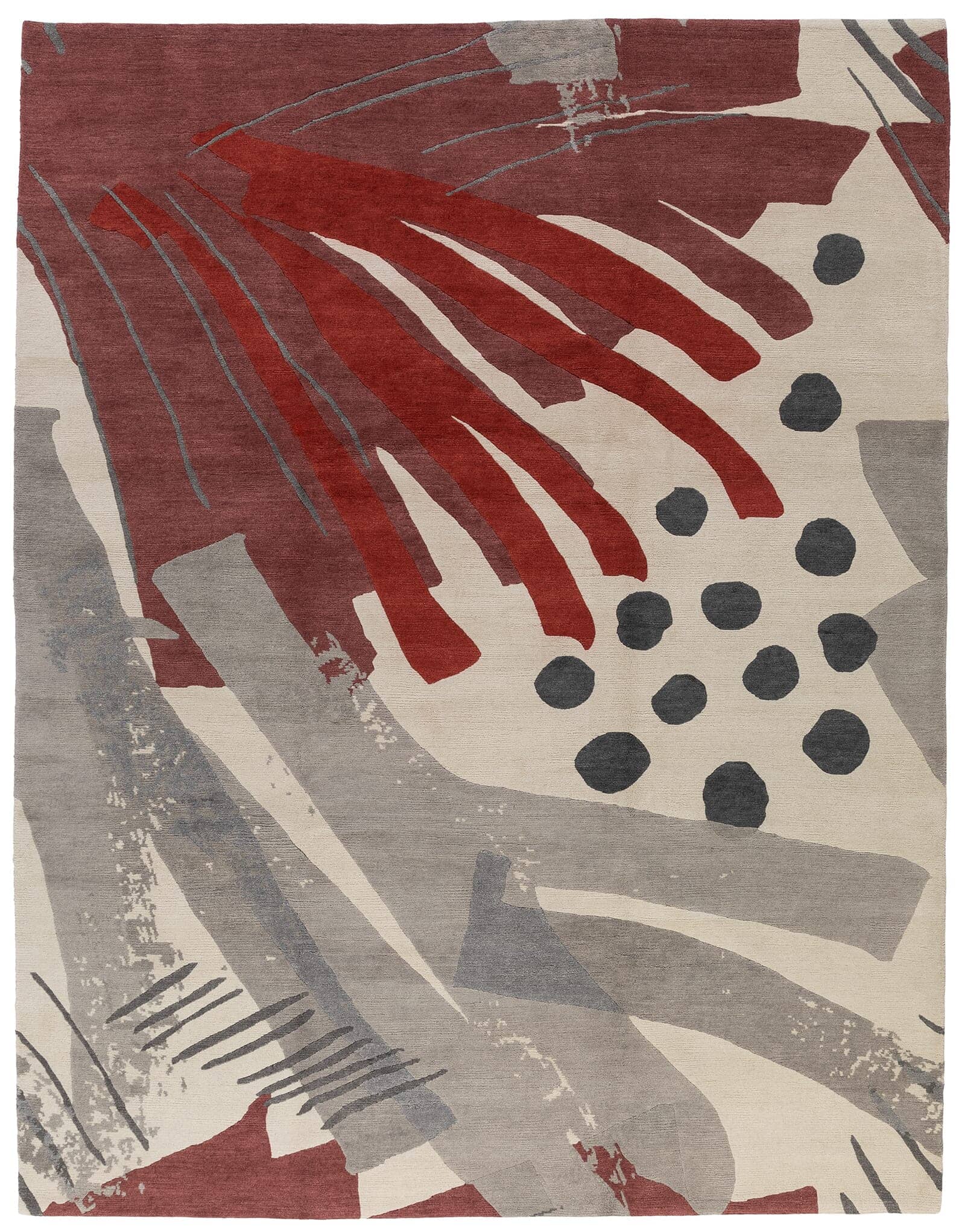 Infuse your room's décor with the modern energy of Plume Red Rose. Hand knotted of 100% wool in Nepal, this rug features a palette of off-white, rose and ruby red, and greys. Evocatively abstract yet relatable and welcoming, this rug is an embrace of vivid color, collage-like graphics, and bold, attention demanding composition. This is a one of a kind production sample from the collection known as BLOCKS AND THINGS.