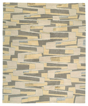 A lively Mark Pollack Shakti weave rug in beige and green with movement and rhythm. Zigzaggery by Mark Pollack draws attention to the floors with this work of art. This rug was hand-knotted in Nepal of the finest Tibetan wool and silk using our Shakti weave. The pile has a smooth, luxurious finish and pile height of about 0.28 inches. Zigzaggery Alabaster is available in a variety of sizes which can accommodate small and larger spaces. The pattern is a beautiful contrast of off white, yellow beige and greyish green celadon. The off white design is outlined in green silk giving it a defined appearance, silk is also set throughout the design in both green and gold. Zigzaggery is the perfect contemporary addition for any space.