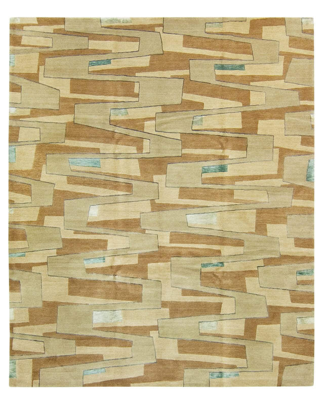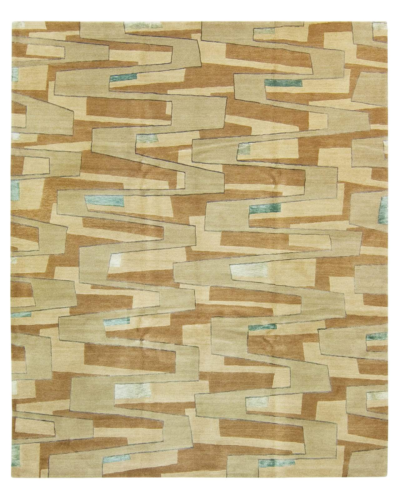 A lively design with movement and rhythm, Zigzaggery by Mark Pollack draws attention to the floors with this work of art. This rug was hand-knotted in Nepal of the finest Tibetan wool and silk using our Shakti weave in a rich, caramel brown palette. The pile has a smooth, luxurious finish and pile height of about 0.28 inches. Zigzaggery Caramel displays an elegant contrast of beige, taupe and brown colors with silk accents in aquamarine, plum and silver. Zigzaggery is the perfect contemporary addition for any space.